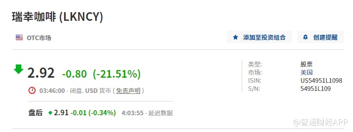 当天瑞幸咖啡在美国场外交易市场大幅收跌近22%,不过盘后股价小幅上涨0.34%。