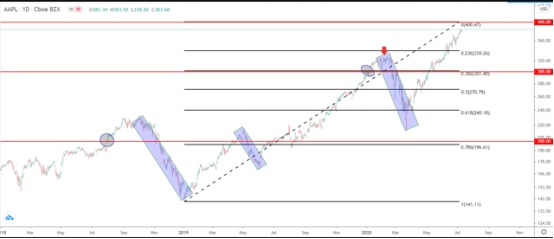 下图为苹果股价日线图,目前股价比400美元这一重要关口低了14美元。Nyaga预计多头会继续把价格推到这个水平。从历史来看,当苹果股价越过一个重要的心理水平时,往往会出现明显的回调。2018年7月,该股在突破200美元后大幅回调。他预计该股在突破400美元后会出现回调,支撑位是330美元左右,略低于23.6%的斐波那契回调位。