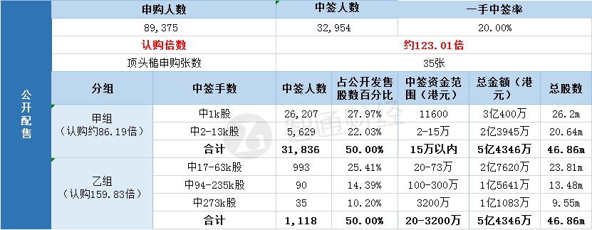 其中,公开配售申购人数89375人,一手中签率20%,认购倍数约123.01倍。