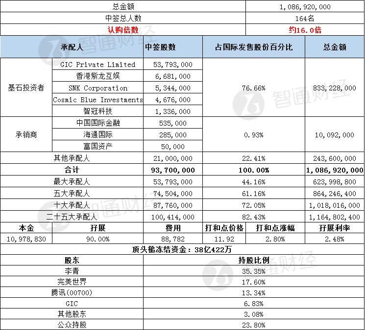 智通财经APP获悉,7月14日,祖龙娱乐(09990)配售结束。配售招股价9.8-11.6港元,最终定价11.6港元,每手11600港元。
