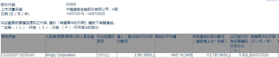 智通财经APP获悉,联交所最新资料显示,7月8日,Mingly Corporation减持中金公司(03908)208.16万股,每股作价19.2405港元,总金额约为4005.10万港元。减持后最新持股数目约为1.13亿股,最新持股比例为5.92%。