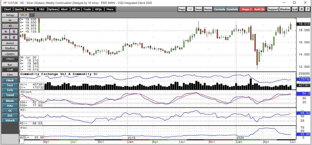 银价自3月中旬低点以来经历了“V型”反弹。在创下11年来新低之后,银价在7月初升至2020年新高,自2019年9月以来首次超过每盎司19美元。