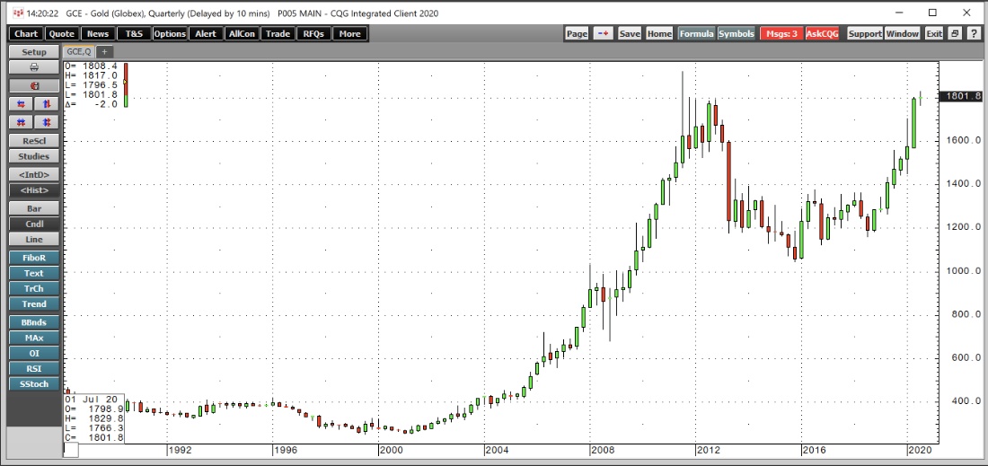 黄金季度图表显示,黄金已经超过了所有的上行技术阻力位,目标价升至每盎司1920.70美元,处于2011年以来的最高水平。最近的高点出现在上周,当时金价创下每盎司1829.80美元的九年新高,距离历史高点仅90.90美元。