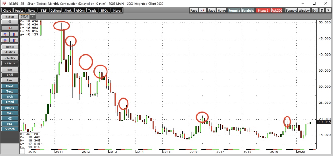 Hecht表示,白银的价格波动有时会很剧烈。在过去的几年里,技术分析难以准确预测白银的价格走势。最近的一个例子发生在今年3月,当时全球大流行引发的避险情绪将白银期货市场推至每盎司12美元以下,为2009年以来的最低水平。技术分析表明白银维持在2015年12月每盎司13.635美元的低点,但连续期货合约突破了这一水平,跌至每盎司11.74美元。价格低于12美元意味着白银市场暴跌。