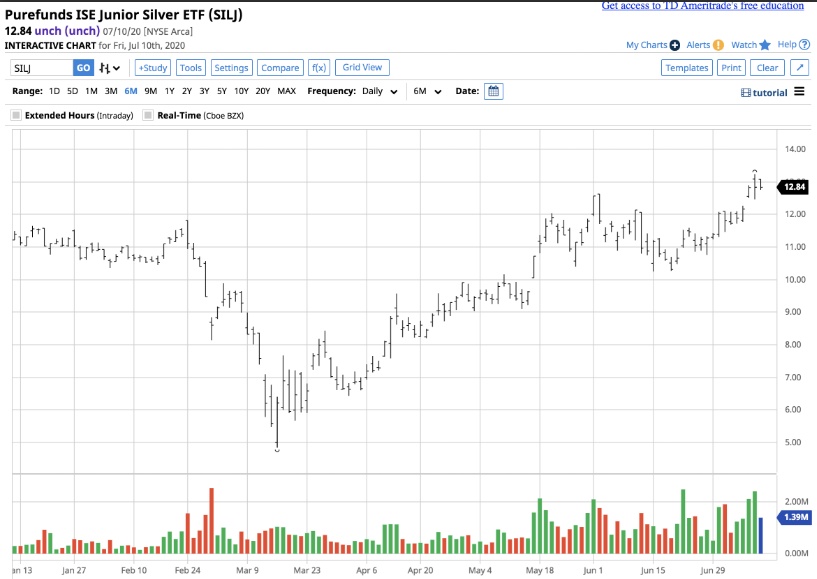 同期,SILJ从每股11.82美元跌至每股4.84美元,跌幅达59.1%,这只初级银矿ETF的表现逊于白银市场。然而,银价反弹使SILJ在7月9日达到13.24美元的高点,涨幅超过173.5%。如果白银价格在未来几周和几个月里走高,SILJ可能会提供比白银期货市场更高的杠杆回报。