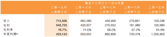 上市四周年以来,公司业绩保持着稳定的增长。智通财经APP了解到,公司2015-2019年营收分别为1.63亿元人民币(单位下同)、2.71亿元、4.04亿元、5.82亿元和7.13亿元,营收不断增长,年均复合增长率高达44.6%;而毛利率方面,公司2015-2019年分别为64.9%、67.2%、68.2%、74.5%和76.7%,同样逐年上行;营收规模、毛利率同步上升使得公司核心纯利率大幅增长,截止2019年末核心纯利率高达63.8%,较2015年26.8%增长了37个百分点,4.55亿元核心纯利也较2015年的4367.7万元增长了940.6%,年均复合增长率高达79.6%。