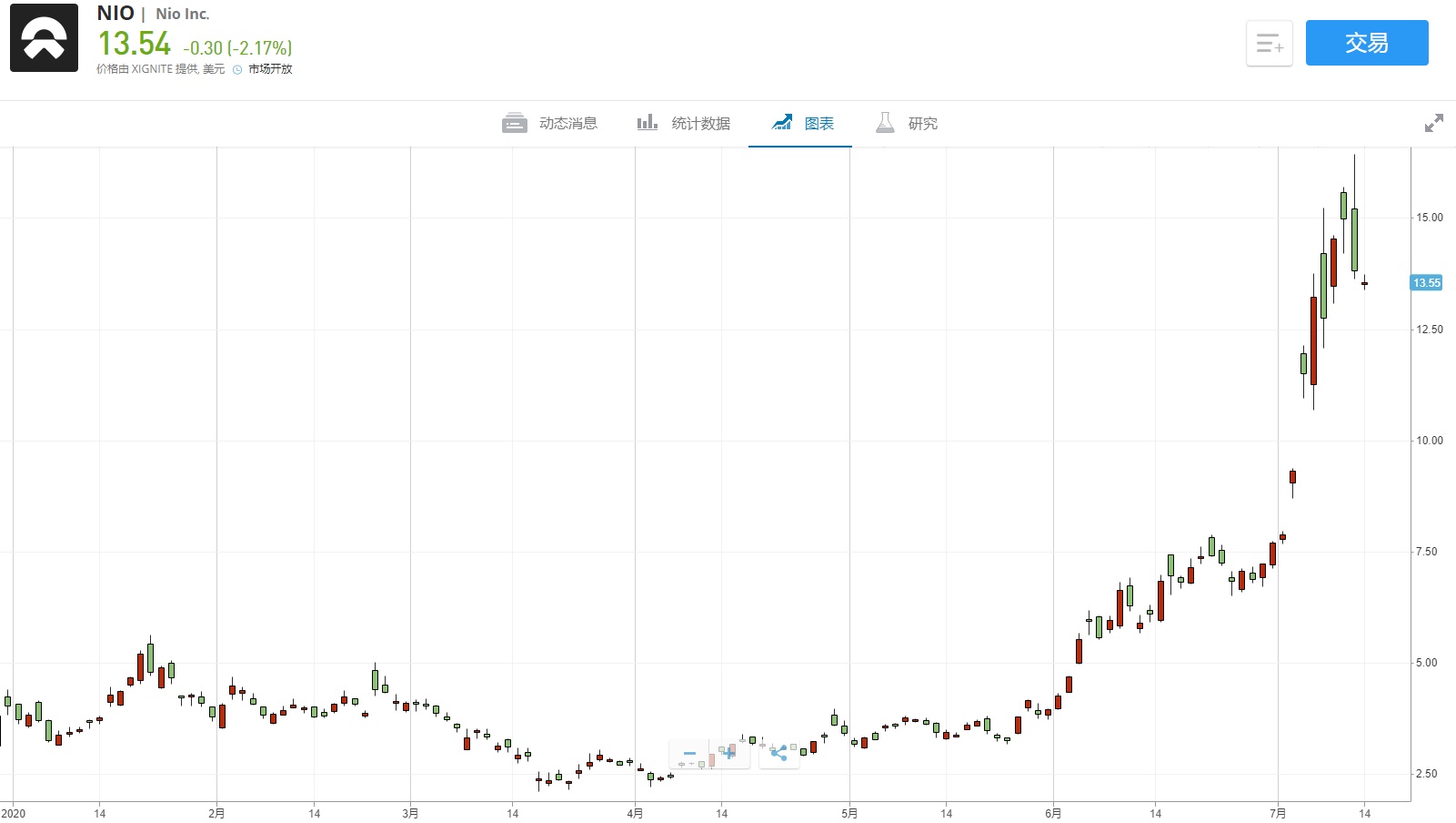 智通财经APP获悉,7月14日(周二)美股盘初,截至21:40,蔚来(NIO.US)跌3.5%,报13.4美元。6月以来,蔚来股价上涨空间接近3倍。