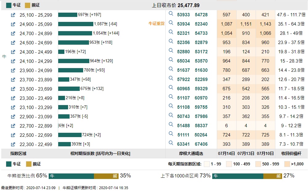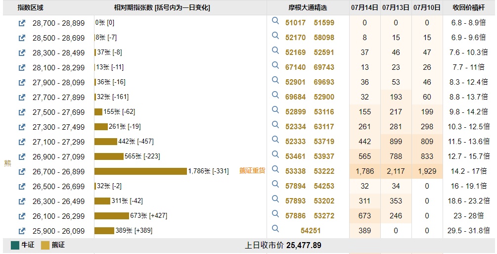 智通财经APP获悉,截至7月14日,恒指最新的牛熊街货比例65:35。摩根恒指牛熊证街货分布图中的数据显示,熊证街货重货区在26700-26899区间,该区间最新熊证数量为1789张,较上一交易日减少331张,最多新增区间在26100-26299区间,较上一交易日增加427张。牛证街货重货区在24900-25099区间,该区间最新牛证数量为1087张,较上一交易日减少64张,最多新增区间在25100-25299区间,较上一交易日增加197张。