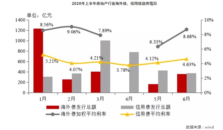 融资成本走低,境外融资规模小幅下降。2020年1-5月,房地产开发到位资金6.3万亿元,同比下降6.1%,5月单月到位资金同比由负转正,同比增长约10%。上半年,房企信用债发行总规模3282亿元,同比基本持平,平均利率为4.3%,同比下降1.2个百分点,其中,中期票据和短期融资券发行规模上升,公司债和定向工具发行规模有所下降,海外债发行规模为2482.2亿元,同比基本持平,平均利率为8.4%,同比下降0.4个百分点,值得注意的是,4月受海外公共卫生事件蔓延和境外资本市场大幅波动影响,房企海外发债暂停。