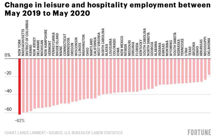 今年春天,纽约州是美国在此次卫生事件中死亡人数最多的州,死亡人数超过3.2万。此外,休闲和酒店行业的就业降幅也最大。根据美国劳工统计局的数据,纽约的休闲和酒店工作岗位从2019年5月的961,000个下降至2020年5月的364,100个。