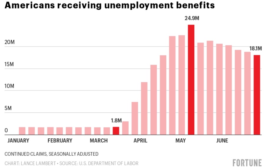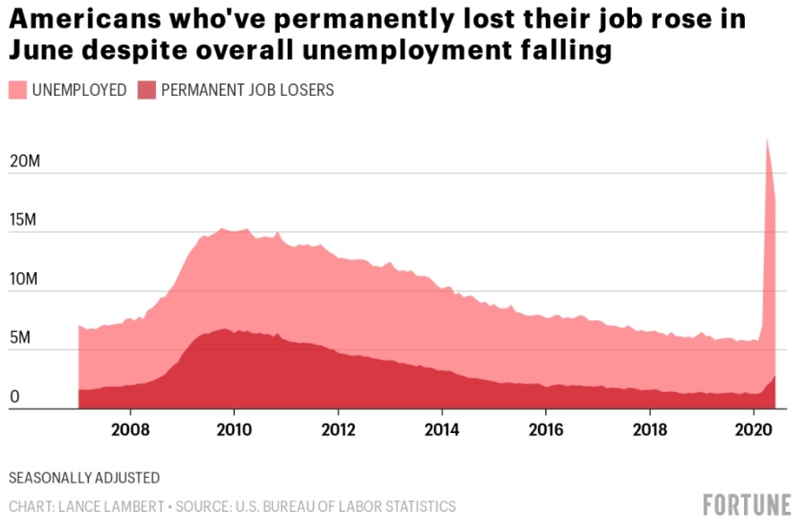 美国4月份失业人数超过2310万,远高于2007-2009年大衰退时期1540万的峰值。但目前已经有一部分人重新就业。在4月和6月之间,美国失业人数减少530万至1780万。