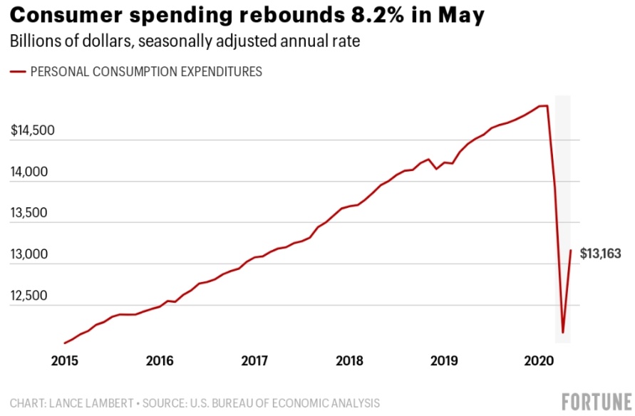 美国消费者支出在3月和4月分别下降了6.6%和12.6%。但据美国经济分析局(U.S. Bureau of Economic Analysis)数据,该指标在5月份反弹了8.2%创新高。