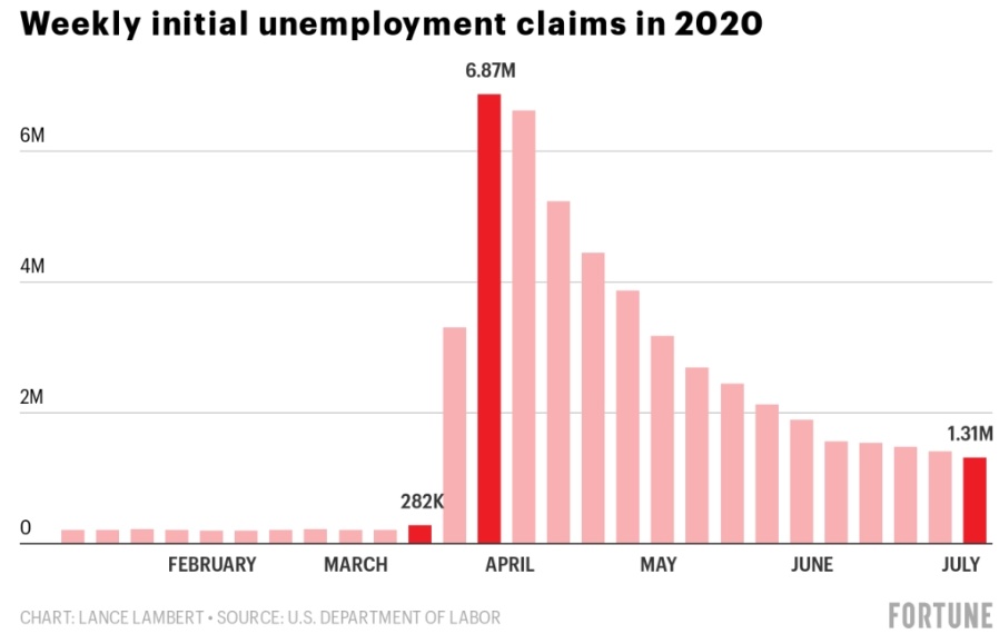 截至美东时间3月14日当周,共有28.2万美国人首次申请失业救济。仅仅两周后,大流行的爆发就使这个数字激增到惊人的690万。自那以来,初请失业金人数连续14周下降,截至7月4日当周初请失业金人数为130万人左右。但这仍然意味着初请失业金人数连续15周超过100万,这在2020年3月之前从未出现过。
