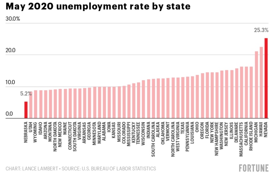 卫生事件对一些地区的经济影响比其他地区更严重。在旅游业受到重创的内华达州,失业率为25.3%,略低于其在美国大萧条时期25.6%的失业率。