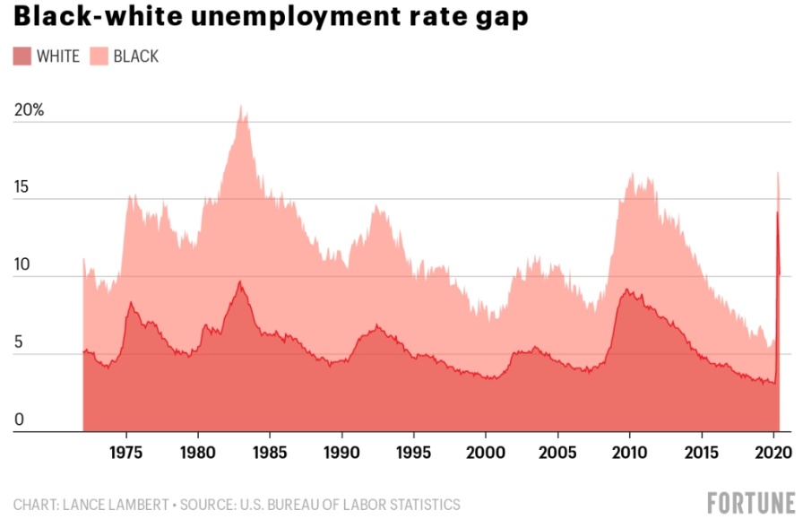 在这场大流行中,白人工人的失业率为11.1%,略低于黑人工人自1972年以来11.4%的平均失业率。自1972年以来,白人失业率只有三次超过两位数(都出现在2020年大流行期间),而对黑人工人来说,这种情况发生了惊人的405次。