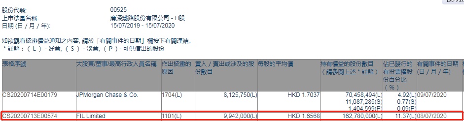 智通财经APP获悉,香港联交所最新资料显示,7月8日,FIL Limited增持广深铁路(00525)994.2万股,每股作价1.6568港元,总金额约为1647.19万港元。增持后最新持股数目为1.63亿股,最新持股比例为11.37%。