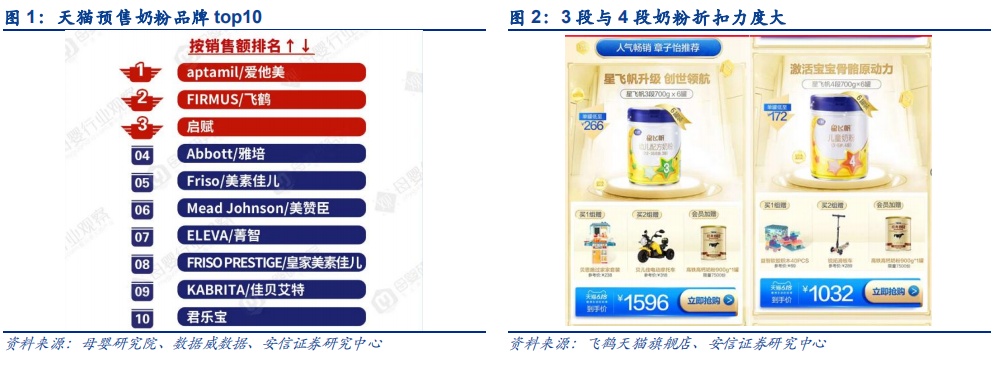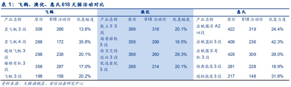 预售成绩亮眼,3 段和 4 段奶粉折扣力度大。飞鹤 618 活动期间于天猫会场预售活动取得较好成绩,根据数据威,飞鹤在天猫 618 预售期 间(5.25-5.31)销售额仅此于爱他美,高于惠氏启赋与雅培,活动期间飞鹤对大部分产品推 出促销优惠及赠品活动,其中 3 段和 4 段奶粉优惠力度最大,星飞帆 3 段 700g*6 罐单罐价 格由 308 元降至 266 元,降价 14%,4 段 700g*6 罐单罐价格由 268 元降至 172 元,降价 36%,另有赠品相送,其他系列如超级飞帆,星阶优护等 3 段产品均有不同程度的折扣。
