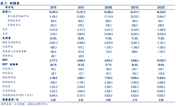 1H20 业绩前瞻:我们预计公司 1H20 收入同比增 41%至 82.9 亿元,调整后 EBIT 同比增加 48%达到 31.5 亿元,对应调整后 EBIT 利润率为 38%,归母净利润同比增 加 44%至 25.3 亿元,对应归母净利润率 30.5%。从板块来看,我们预计高端婴配牛 奶 粉 / 普通婴配牛奶粉 / 其他乳制品 / 营养补充品 收入同比分别 +47%/+24%/+17%/-2%,占收比分别为 72%/21%/4%/4%。在高端婴配牛奶中,超 高端星飞帆/超高端臻稚有机/其他高端产品销量同比分别增 50%/95%/30%,收入同 比分别增 51%/99%/40%,占总收入比分别为 50%/6.5%/15%。