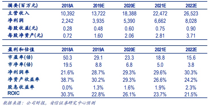 投资建议:买入-A 投资评级,我们预计公司 2020-2022 年收入增速分别为 34%、 22%和 18%,净利润增速分别为 37%、24%和 19%,基于 1xPEG、27%的 2019-2022 年盈利 CAGR 及 2020 年每股收益 0.6 元,给予 6 个月目标价 18 港币。