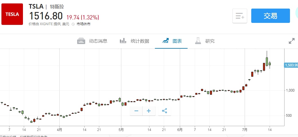 智通财经APP获悉,7月5日(周三)美股盘前,截至16:19,特斯拉(TSLA.US)涨2.96%,报1561.35美元。