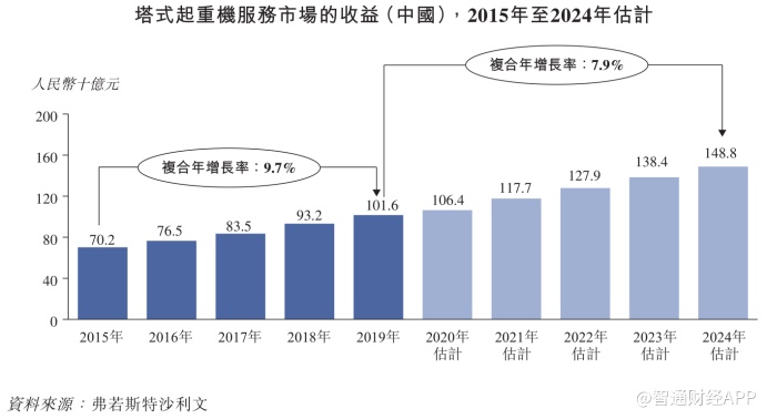 展望行业前景,弗若斯特沙利文预计中国塔式起重机服务市场规模增速将由2015-2019年的9.7%年复合增速发展至2019-2024年的7.9%增速。