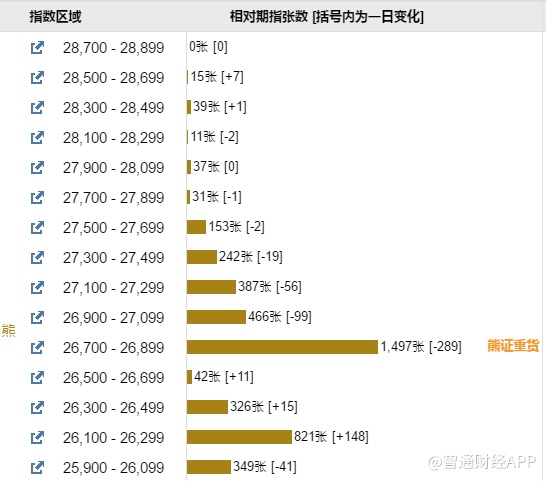 智通财经APP获悉,截至7月15日,恒指最新的牛熊街货比例66:34。摩根恒指牛熊证街货分布图中的数据显示,熊证街货重货区在26700-26899区间,该区间最新熊证数量为1497张,较上一交易日减少289张,最多新增区间在26100-26299区间,较上一交易日增加148张。牛证街货重货区在24900-25099区间,该区间最新牛证数量为1143张,较上一交易日增加56张,最多新增区间在25100-25299区间,较上一交易日增加163张。