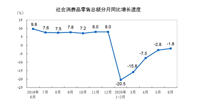 6月份,社会消费品零售总额33526亿元,同比下降1.8%(扣除价格因素实际下降2.9%,以下除特殊说明外均为名义增长),降幅比上月收窄1.0个百分点。其中,除汽车以外的消费品零售额29914亿元,下降1.0%。