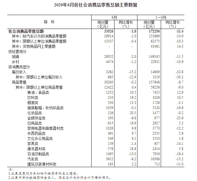 1—6月份,社会消费品零售总额172256亿元,同比下降11.4%。其中,除汽车以外的消费品零售额155869亿元,下降10.9%。