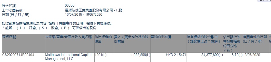 智通财经APP获悉,香港联交所最新资料显示,7月13日,Matthews International Capital Mgt减持福耀玻璃(03606)102.28万股,每股作价21.5471港元,总金额约为2203.84万港元。减持后最新持股数目为3437.76万股,持股比例降至6.79%。
