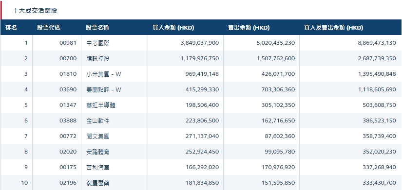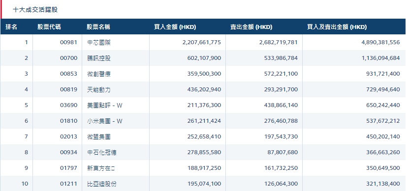 中芯国际(00981)再遭净卖出16.46亿港元。消息面上,中芯国际今日正式登陆科创板,收涨202%,报82.92港元,全天成交额479.7亿,跻身A股历史第四大单只个股成交金额。港股中芯国际遭重挫,今日收跌超25%。中泰国际策略分析师颜招骏表示,中芯国际股价自6月以来涨幅超过100%,目前利好因素已兑现,获利回吐也属正常。而且目前中芯的技术要落后台积电一至两代,研发开支也只是台积电的3分1左右,股价比基本面跑得太前,稍有调整也是可预期。值得一提的是,同属半导体板块的华虹半导体(01347)亦遭沽售,全天净卖出额达1.06亿港元。