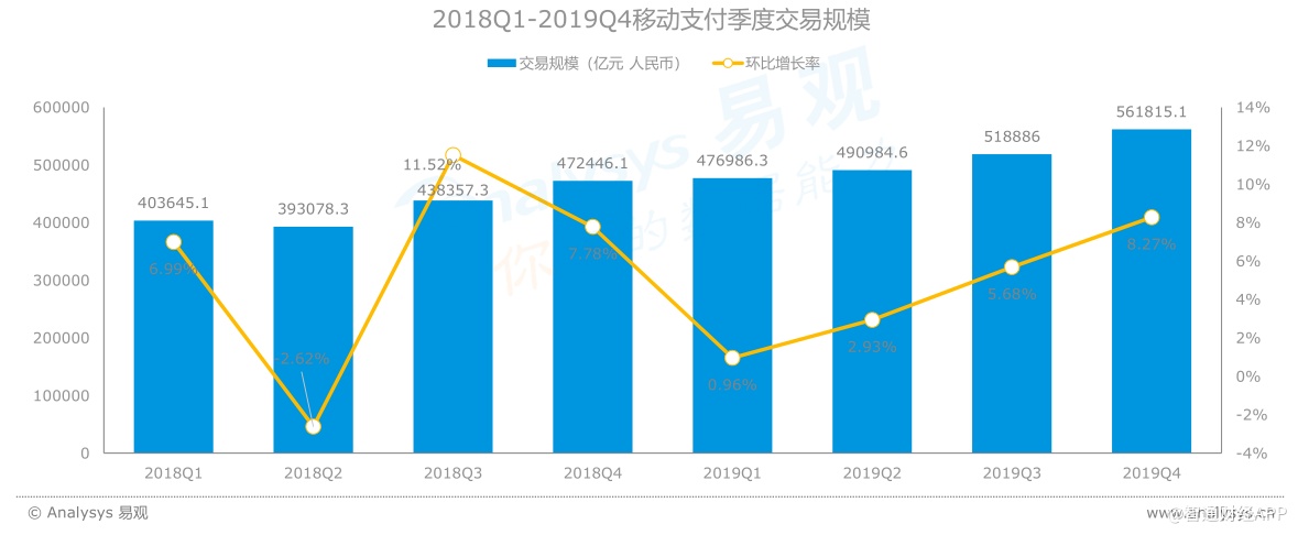 从行业发展而言,移动支付的交易规模增速虽连续两年下降,但整体规模仍稳步增长。据易观数据显示,2019年第四季度时,移动支付的交易规模为56.18万亿人民币,同比增长8.27%,行业稳步增长。
