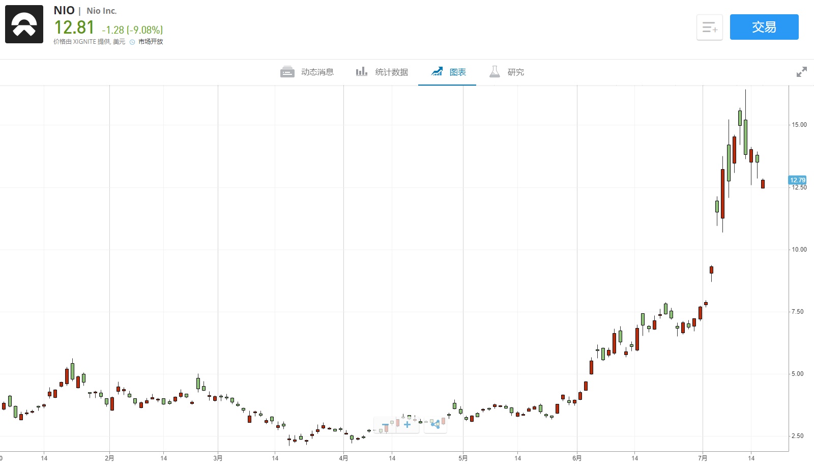 智通财经APP获悉,7月16日(周四)美股盘初,截至21:34,蔚来(NIO.US)跌5.1%,报12.8美元。7月以来,蔚来股价一度涨超1倍。