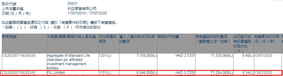 智通财经APP获悉,香港联交所最新资料显示,7月13日,FIL Limited增持利亚零售(00831)694.6万股,每股作价3.725港元,总金额约为2587.39万港元。增持后最新持股数目为7120.4万股,最新持股比例为9.34%。