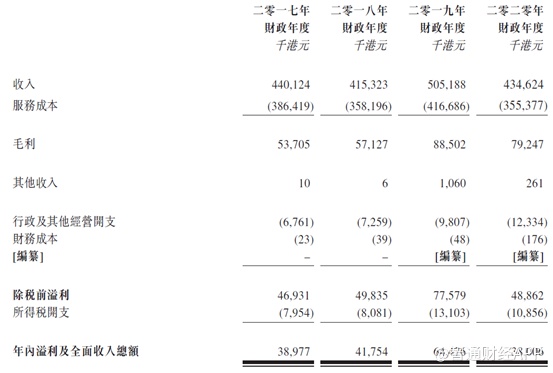 招股书显示,过去四个财年内,公司分别自20、23、29及37个项目产生收入约为4.4亿港元、4.15亿港元、5.05亿港元及4.34亿港元,组成各年度的全部收入。根据项目性质,公司项目可分为楼宇建筑项目及土木工程项目。