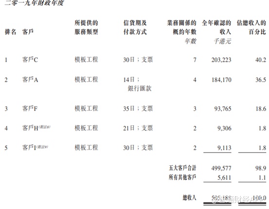 更令人关注的是,天任集团有重大部分收入来自有限数目的客户。2017-2020财年内,公司的最大客户占总收入约30.5%、35.7%、40.2%及41.2%,而公司的五大客户合计分别占总收入约97.6%、92.1%、98.9%及93.8%。由此来看,天任的业务十分依赖于成功中标非经常性模板工程项目以及主要管理人员,而重大部分收入则归因于大客户所授予的合约及工程订单。