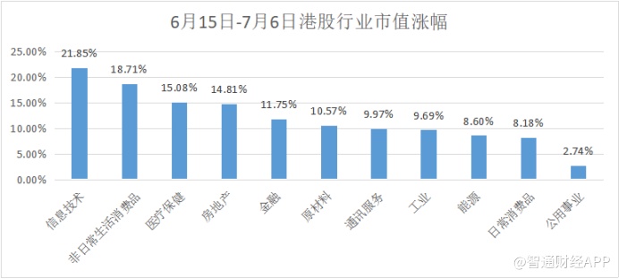 其中,纵观6月中下旬以来港股市场表现,港股各行业板块于6月15日-7月6日期间总体市值增幅达13.88%。其中,端午节后(6月30日-7月6日)涨幅便达9.04%。