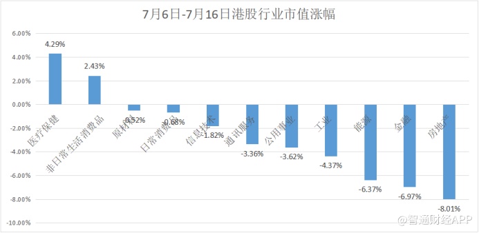 7月7日,恒生指数开始出现跌势,截至7月16日,港股各行业板块总体市值较7月6日下降3.32%。其中,房地产、金融、能源成为在此期间领跌的板块前三,跌幅分别达8.01%、6.97%、6.37%。