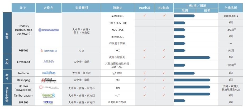 该公司在欧美四个城市设有见识广阔及经验丰富的业务开发团队,其已与全球的生物制药公司建立强大的关系,并有系统地在各重点治疗领域中筛选及评估具差异化、处于后期、已规避风险,且相信在大中华及其他亚太新兴市场有重大商业潜力的资产。严谨及主动地识别及选择新增候选药物是该公司增长策略的中心。