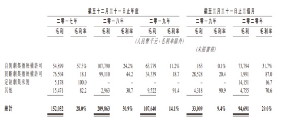 整体毛利率由截至2018年12月31日止年度的30.9%大幅下降至截至2019年12月31日止年度的14.1%,主要由于同期自制及买断剧集播映权许可业务线毛利率下降。整体毛利率由截至2019年3月31日止三个月的9.4%上升至2020年同期的29.0%,主要由于自制剧集播映权许可的毛利率上升。
