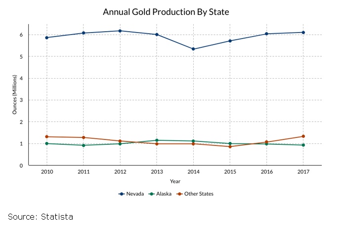 下面这张图是内华达州、阿拉斯加州和其他各州2010年至2017年的黄金产量。