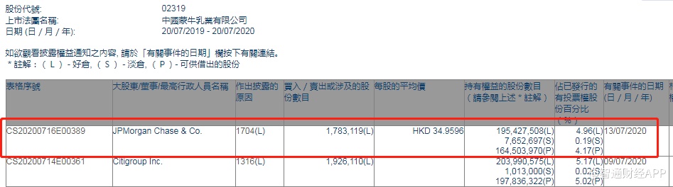 智通财经APP获悉,香港联交所最新资料显示,7月13日,摩根大通减持蒙牛乳业(02319)约178.31万股,每股作价34.9596港元,涉及总金额约为6233.65万港元。减持后最新持股数目约为1.95亿股,最新持股比例4.96%。