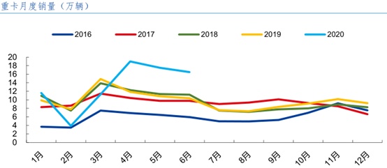 销售数据创历史记录,重卡高景气正在上演。智通财经APP了解到,2020年6月,我国重卡市场销售各类车型16.5万辆左右,同比增幅高达59%,创6月销量历史记录,而且大幅超过2018年6月11.2万辆的上一纪录体量。同时,2020年1-6月重卡累计销售达到了81.4万辆,同比增长24%,同样创出上半年的重卡销量新高,行业高景气度态势明显。