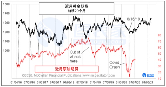 分析师Tom McClellan在5个月的一篇文章中指出,黄金价格走势是领先原油20个月的指标,2018年金价触及预示着原油价格将于2020年4月触底。