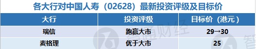 一、各大行对中国人寿(02628)最新投资评级及目标价