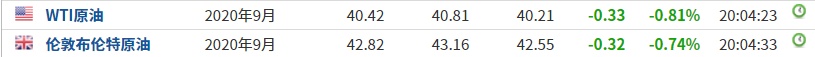 截至发稿,WTI原油跌0.81%,报40.42美元/桶。布伦特原油跌0.74%,报42.82美元/桶。