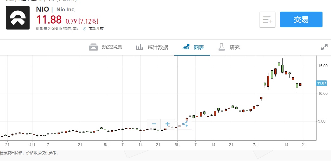 智通财经APP获悉,周一(7月20日)美股开盘,蔚来(NIO.US)股价上扬,截至北京时间21:53,涨7.12%,报11.88美元。据悉,此前五个交易日蔚来跌幅达26%。