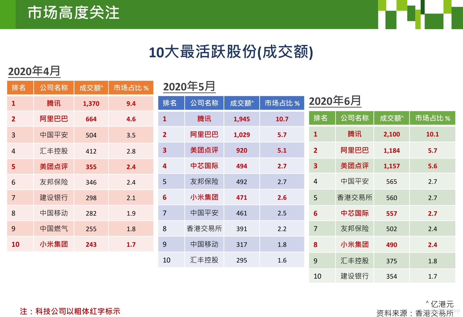 在此次恒指公司披露的资料中,也反映出了相同的趋势。以成交额计算,港股前十大活跃股份中,科技行业总占比不断提高。