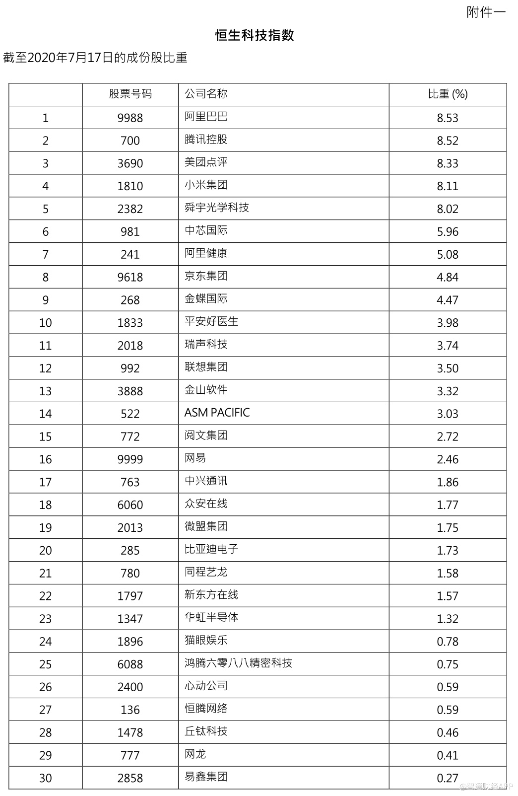 截至7月17日,新指数成分股比重最大的十大上市公司分别是:阿里巴巴(09988)、腾讯(00700)、美团(03690)、小米(01810)、舜宇(02382)、中芯国际(00981)、阿里健康(00241)、京东(09618)、金蝶(00268)及平安好医生(01833)。