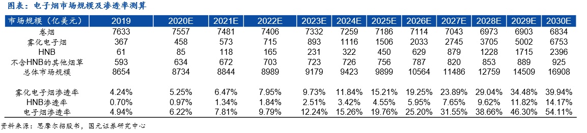 1)2020年电子烟渗透率6.2%,2025年19.76%,2030年54.11%;假设及测算过程如下