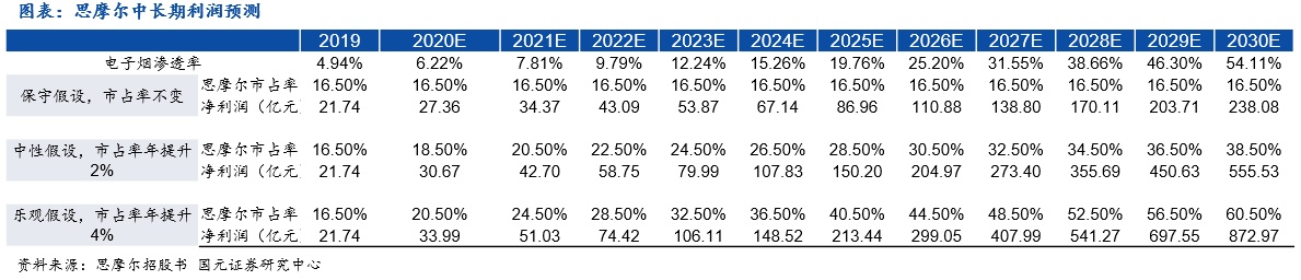 参考招股书弗若斯特沙利文对于雾化电子烟和加热不燃烧烟(测算得出)的2019-2024年复合增速,我们假设雾化电子烟2019-2030年复合增速为24.9%,HNB2019-2030年复合增速为39.7%;